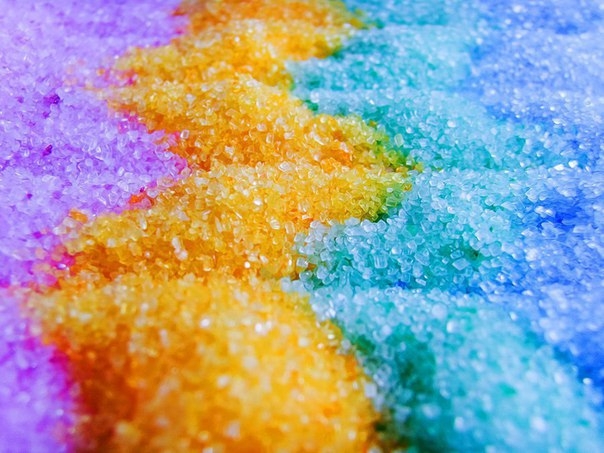 Яркий цветной блеск образуется за счёт игры света в прозрачном кристалле сахара.