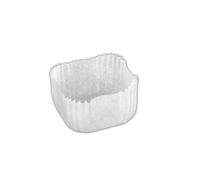 Гофрированная капсула из пергаментной бумаги квадратной формы, белого цвета для упаковки кондитерских изделий, размер дна 33,5х33,5 мм, высота бортика 18,25 мм. Плотность бумаги 55 г/м2.