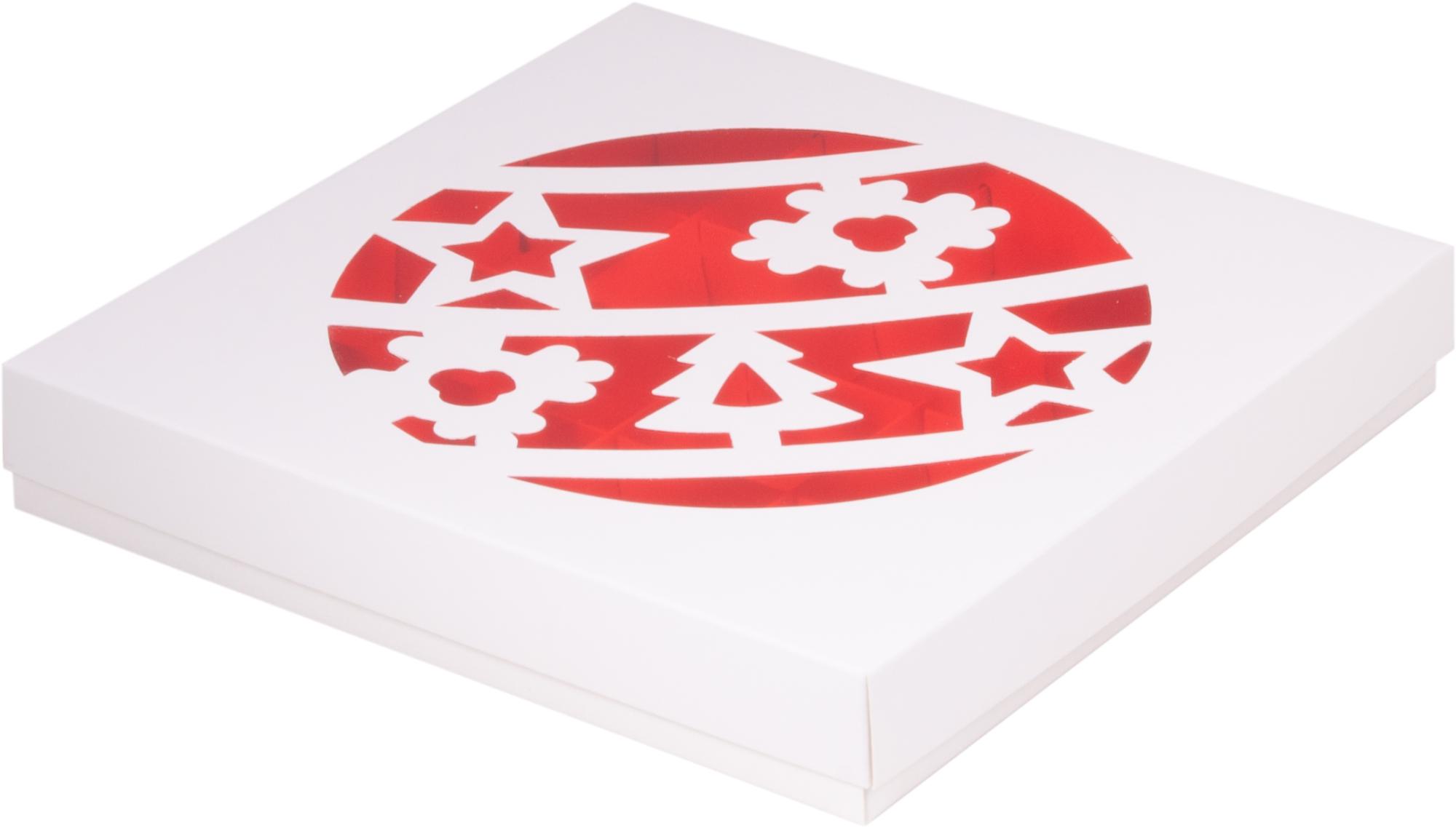Коробка для 8 конфет и плитки с красным окном Новогодний шар 200х200х30 мм и 160х80 мм белая РУ.
