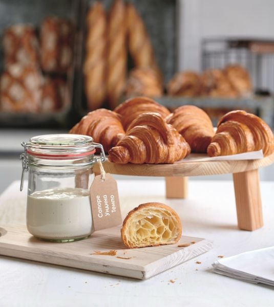 Улучшает органолептические показатели готовых изделий, замедляет процессы черствения; закваска стабилизирована пищевыми волокнами для сохранения однородности при хранении