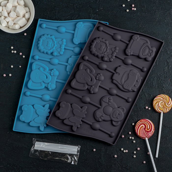 Силиконовая форма «Звери», 27,5×16,5 см, 6 ячеек, с палочками, цвет красный