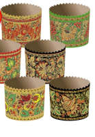 Одноразовая бумажная форма для выпечки дрожжевых изделий (куличей, панетоне и др.) и другой выпечки с цветным рисунком в стиле Хохломской росписи. Нижний диаметр 70 мм, верхний диаметр 77,4 мм, высота 60 мм. Плотность бумаги 95 г/м2.